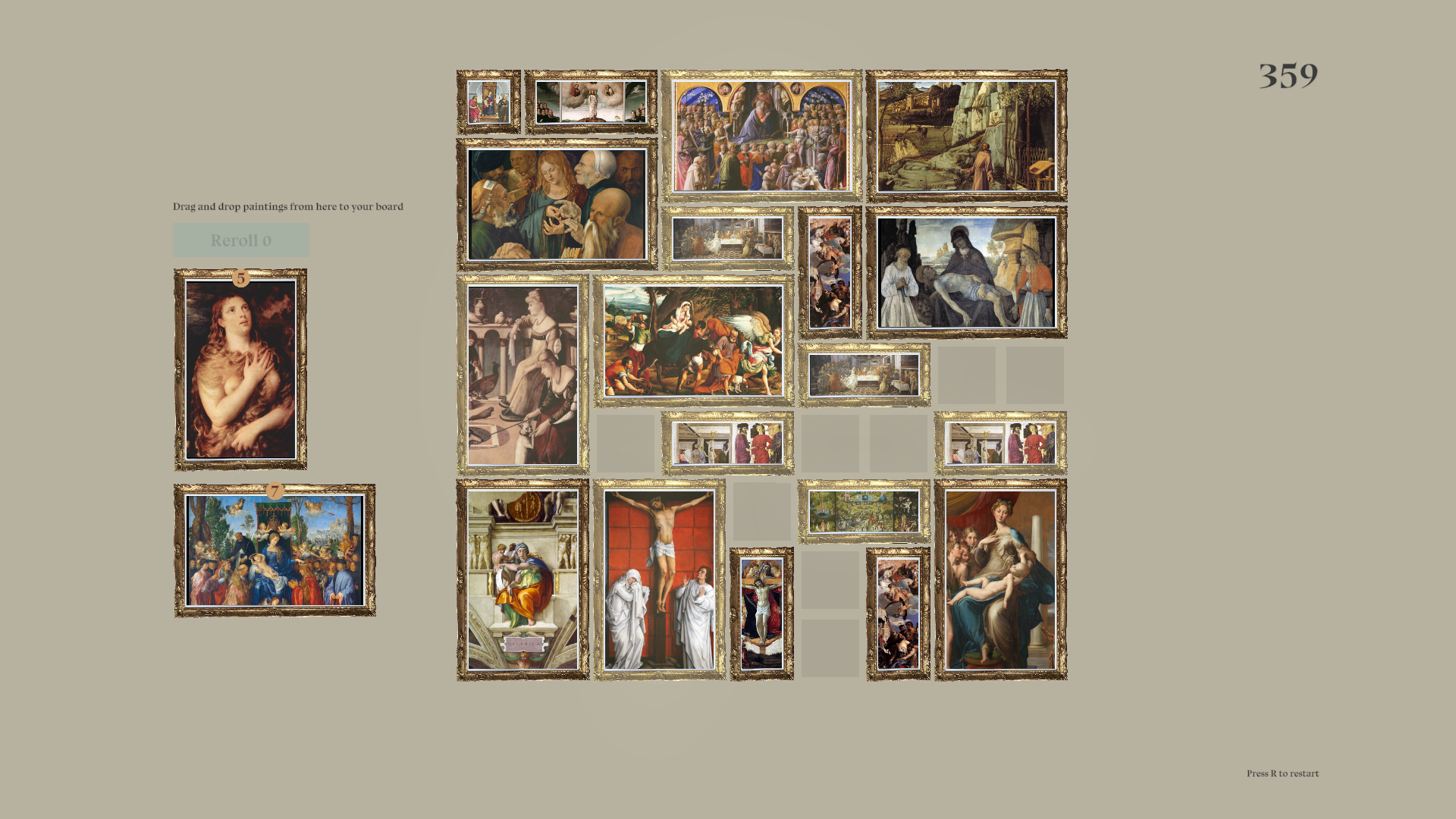 Hehe, i got lucky but my whole strategy was too keep the tab the clearer possible by the hunting for the wiping power + the Jesus painting which have " Reroll number = number of paintings supressed". So i aimed for reroll combo and managed to get a 15 something mult a one point i think, i got more than 150 points in one go.